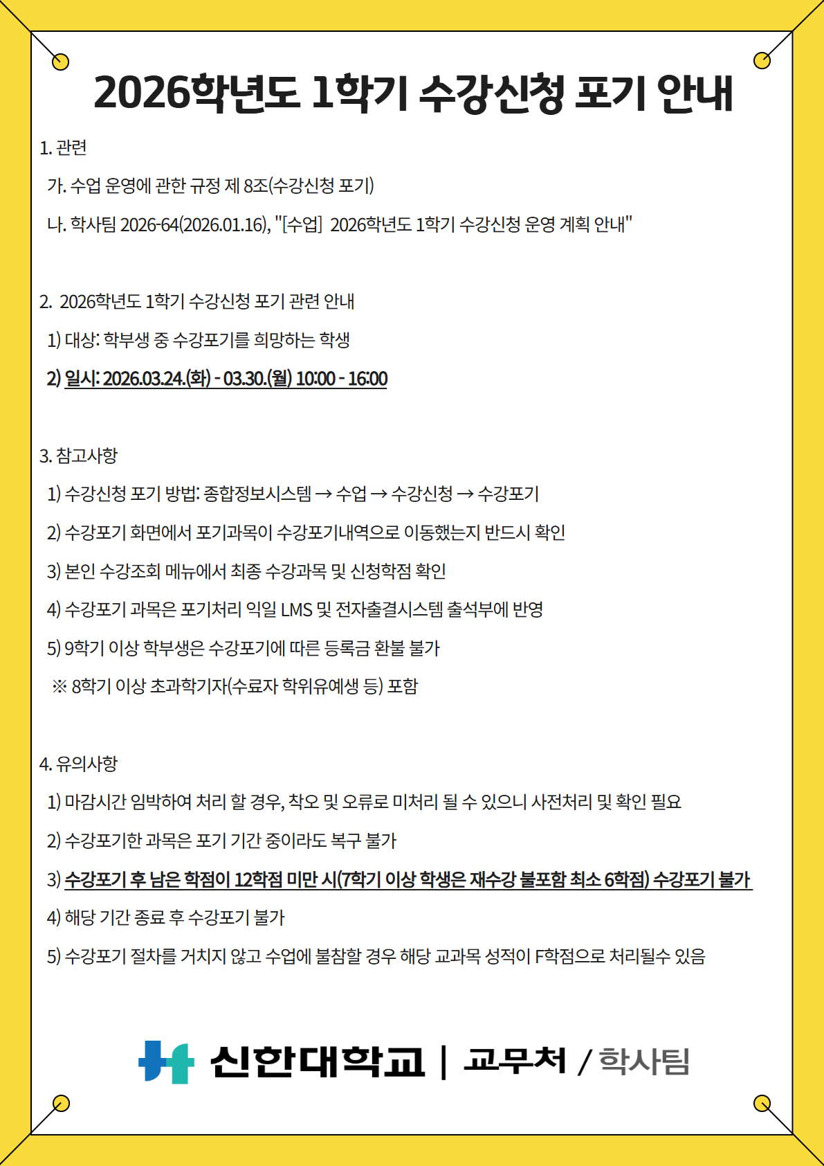 [학사팀/수업] 2026학년도 1학기 수강포기 안내